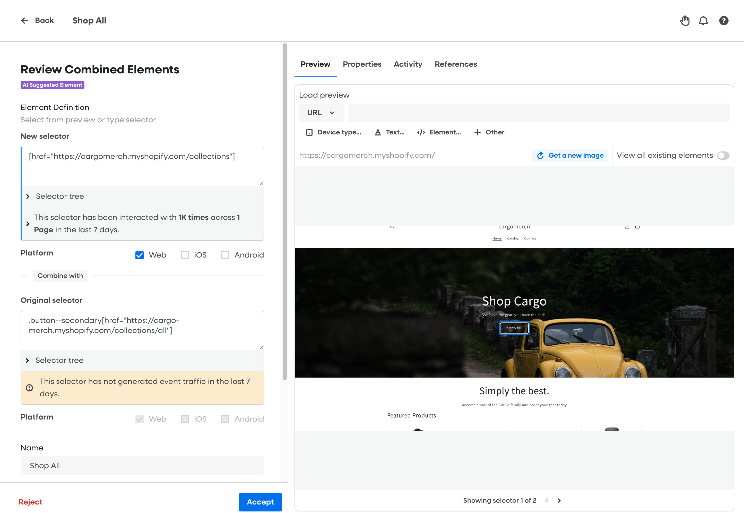 - Adding the suggested selector to the existing element, and modifying the name or description as is necessary. The suggestion can then be rejected.
