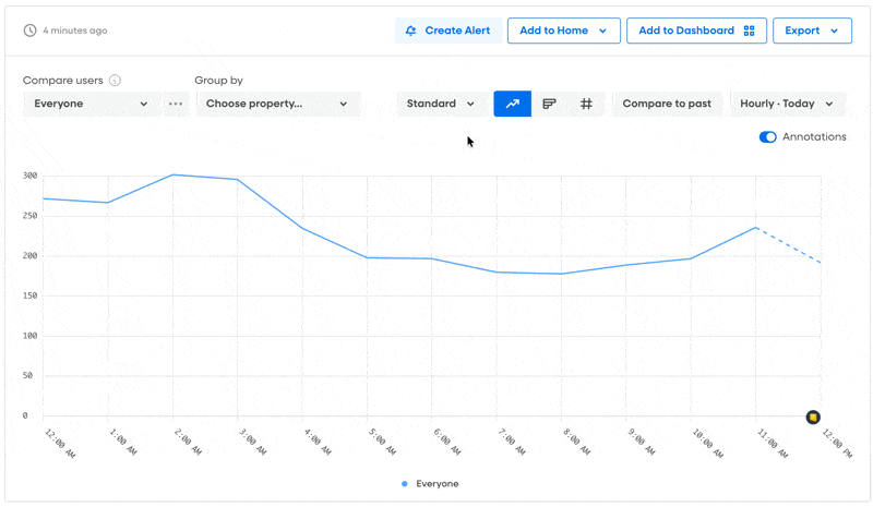 Switch between Standard, Rolling Average or Rolling Window to visualize data points in different ways. Use these to calculate common trends such as Daily Active Users, Weekly Active Users or Monthly Active Users and add them to a dashboard. The Rolling Average & Window views provide a more stable time series analysis by smoothing out natural fluctuations in your data, providing a clearer picture of underlying patterns to help you make informed decisions.